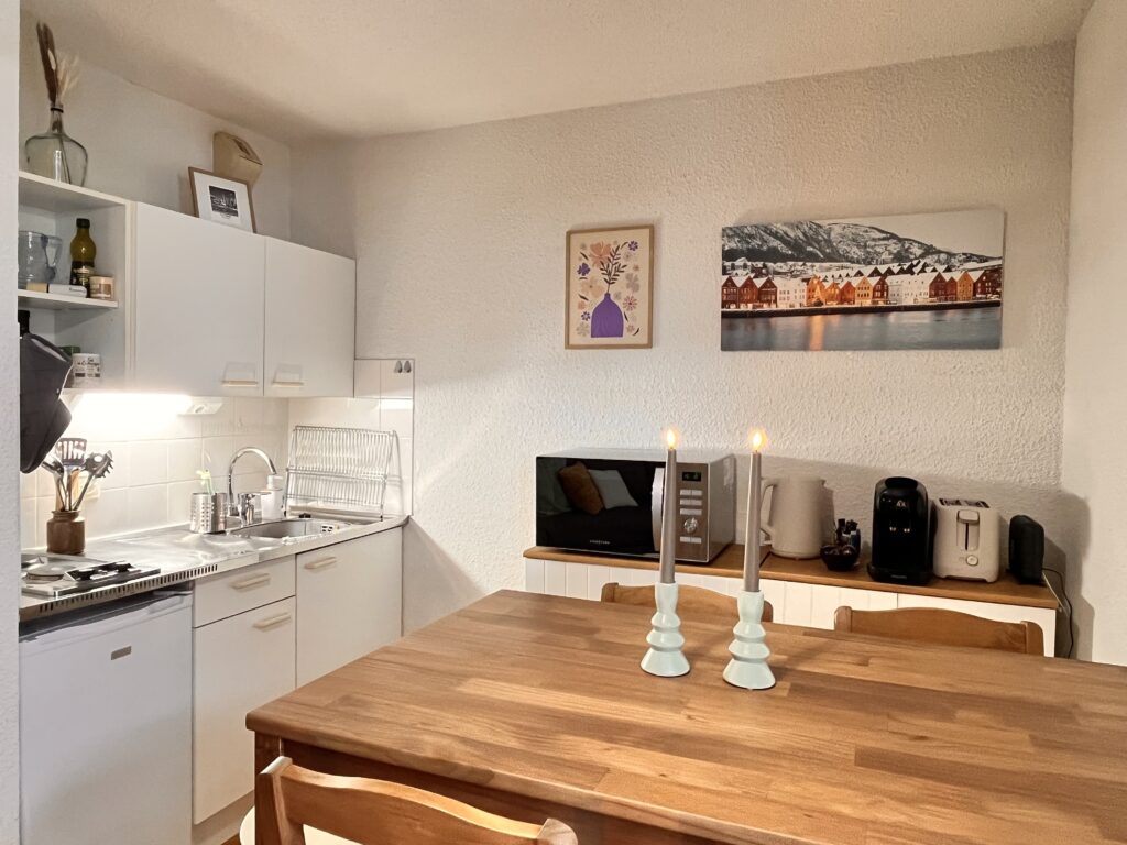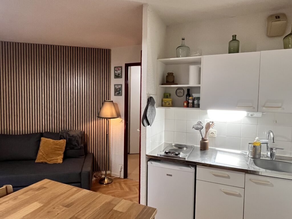 • Compact kitchen: 2-burner induction stove, raclette set, dishware, cookware, Nespresso machine, kettle, cleaning supplies
